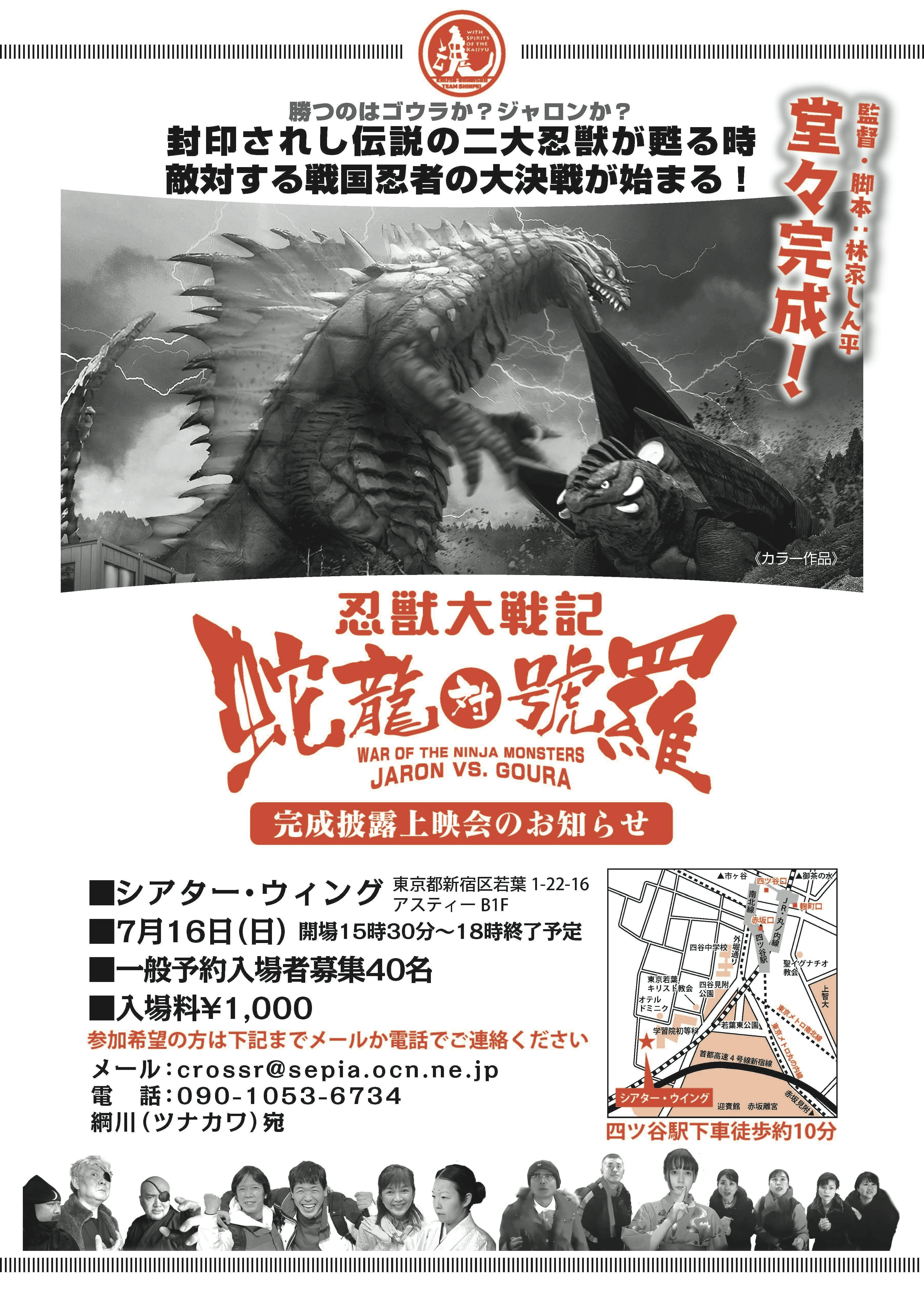 完全オリジナルの脚本から生まれた新しい怪獣映画です。平和な秩父に現れた忍獣蛇龍(ジャロン)と忍獣號羅(ゴウラ)、秩父を守る三峯忍者衆と悪の復活を願う地雷忍者衆が忍獣を操り壮絶な戦いを繰り広げる作品の完成を実現いたします。