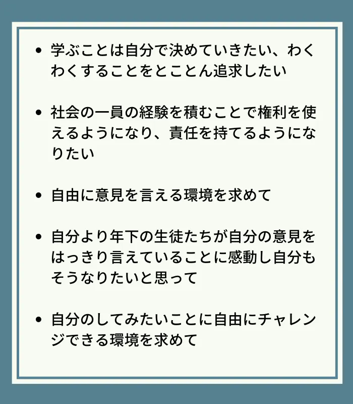 生徒が学校の経営について考え、意見を言う機会や、皆が自発的に考え活動できたり、生徒とスタッフが人として対等に付き合えたりする環境は、普通の学校にはないとても素晴らしいものだと感じました。