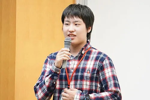 大学生向けにサドベリー教育の講義をする生徒。