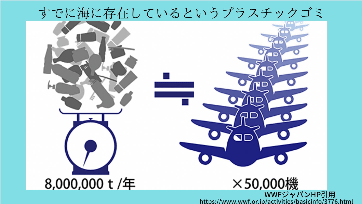 WWFの調べでは、すでに海に存在しているというプラスチックゴミは合計で1億5000万トン。