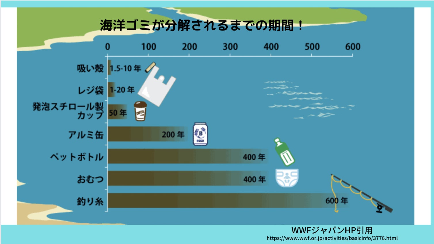 釣り糸(600年)おむつ(400年)ペットボトル(400年)