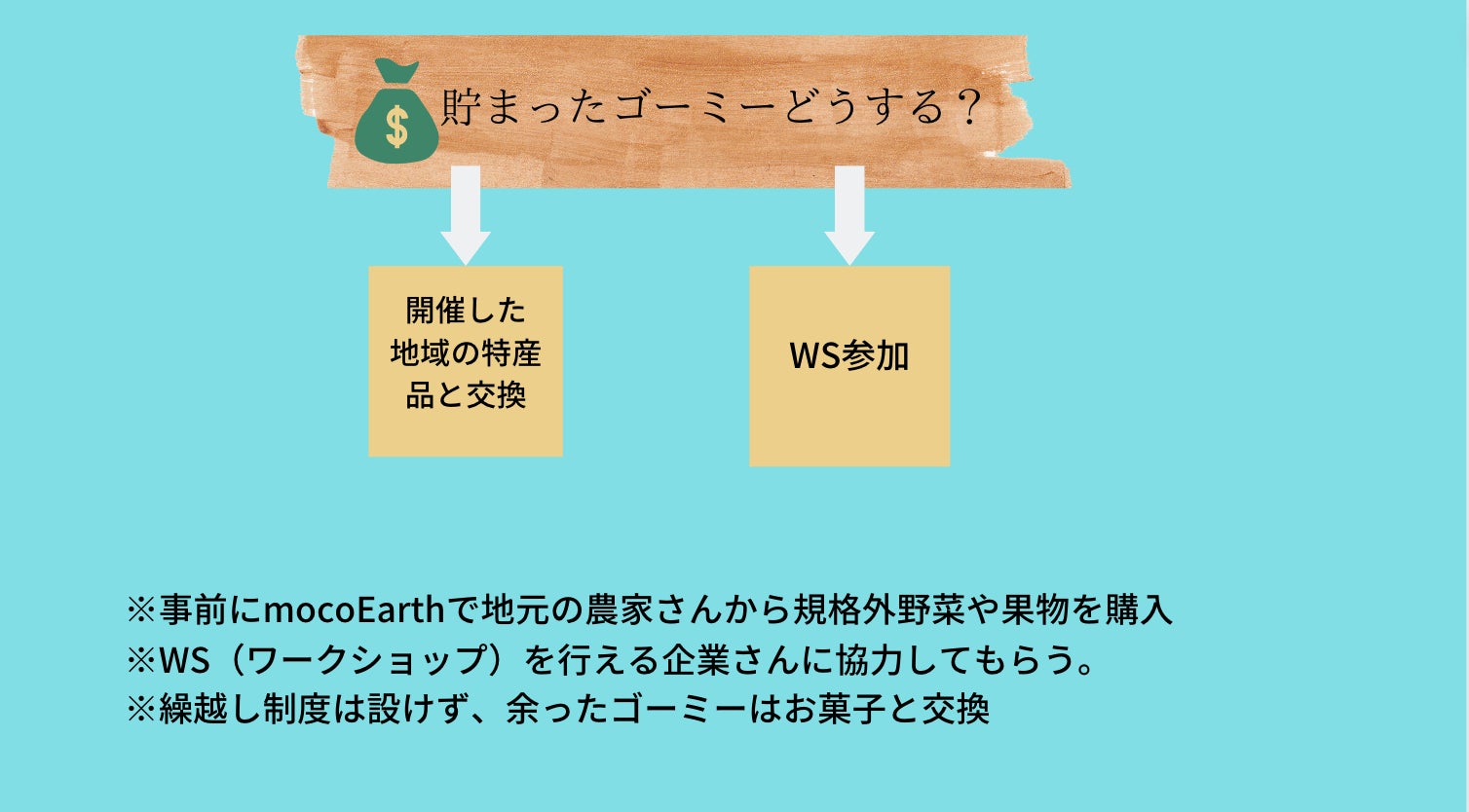 開催させてもらえるから成り立つ遊びであること。サムトルを知ってもらうことと同じぐらい、地域の物も知ってほしいと思っています。自分達が足を運び、対話をした農家さんや個人商店さんのものをゴーミーで交換できるものにしたかった。(規格外野菜や果物を買い取る)ワークショップは私たちがオンラインの習い事で出会ったので、好きなことを学べるような場があるといいなと思ったからです。
