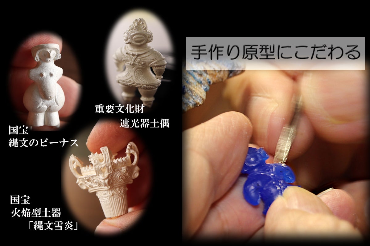 手作り原型にこだわるのには他にも理由があります。それは作品に『命を吹き込む』という根幹にかかわる大切なことだから。縄文時代、土偶は祭祀に用いるために作られたと言われています。土器も単なる道具としてのモノではなく、命の輝き、尊さ、自然への崇敬が込められているのです。
