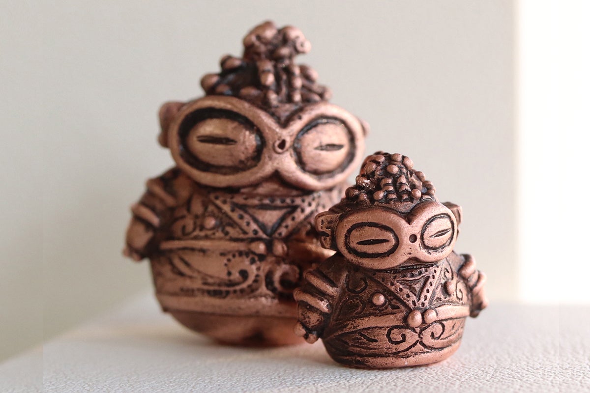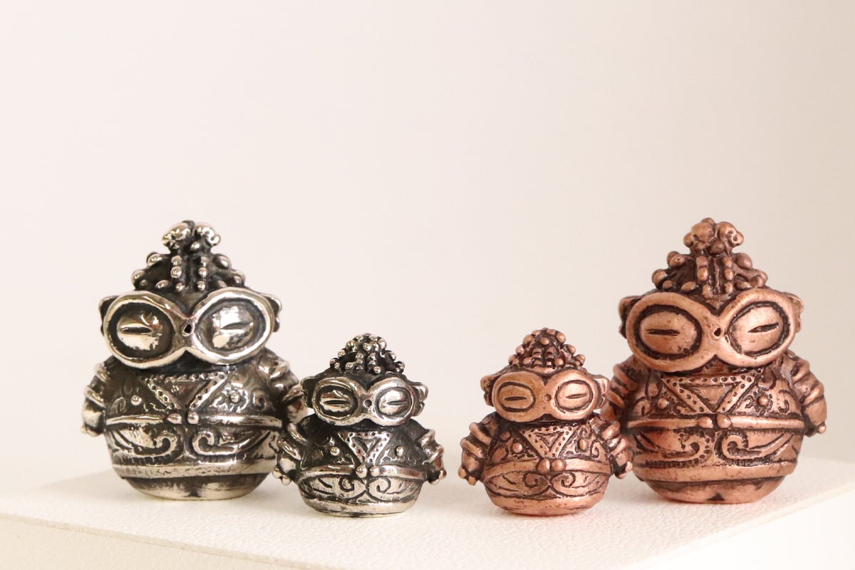 純銅とシルバーの「ダルマ遮光器土偶」たち。小さい方は豆ダルマ遮光器土偶さん