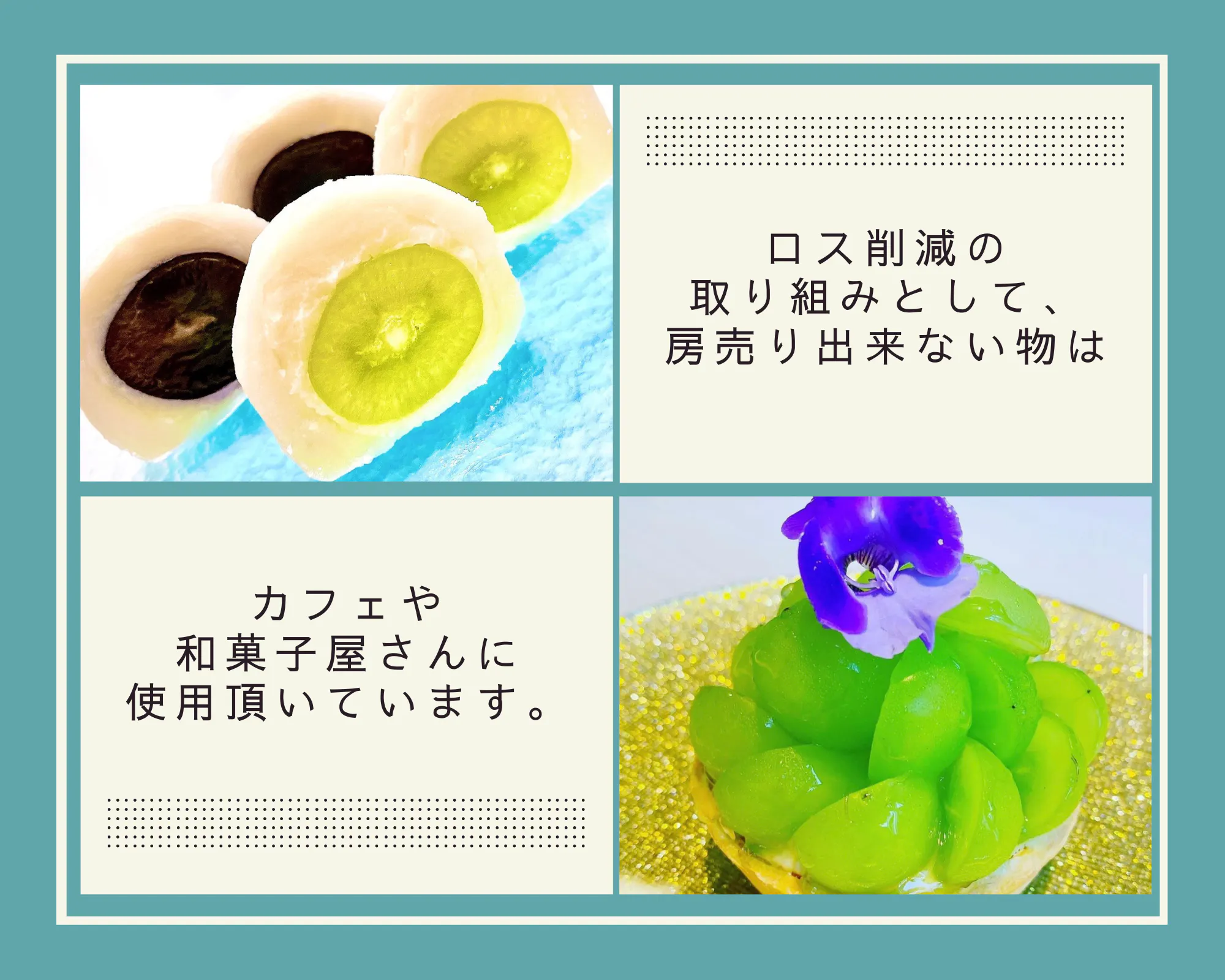 当園ではそんなシャインマスカットもロスにしないよう、飲食店やお菓子屋さんに提供させて頂いております。