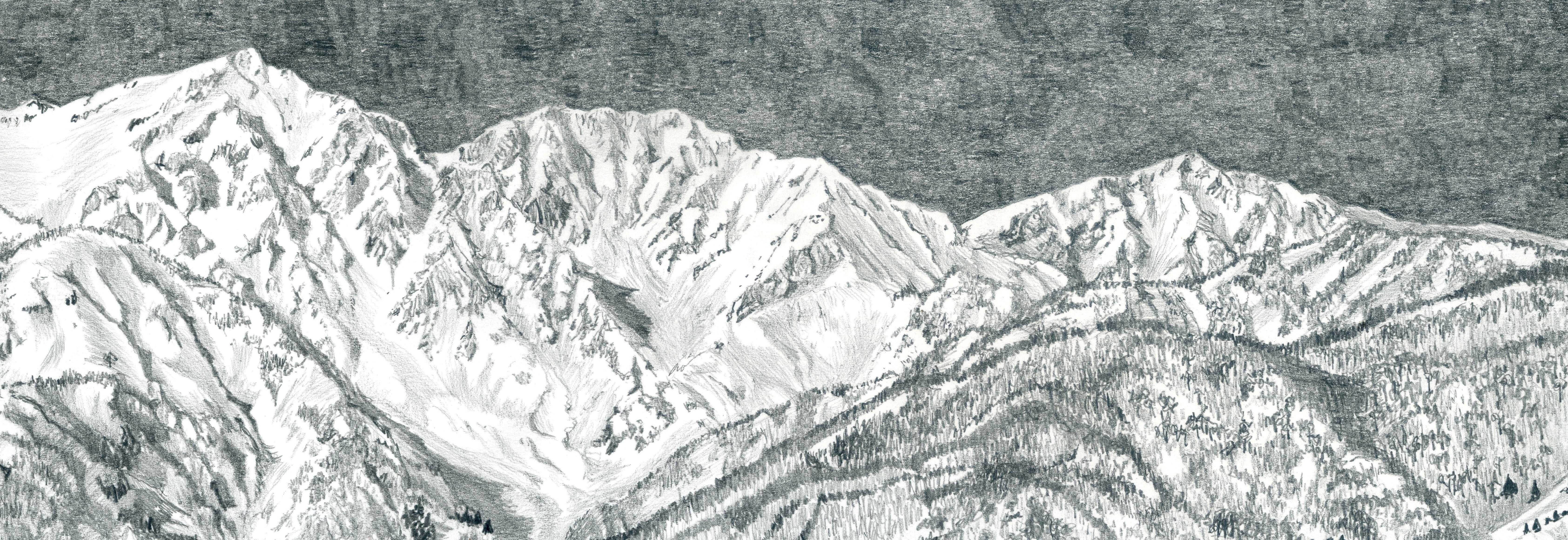 自身、作家としての原点である漫画の、原稿描きに使用していたケント紙と、ごく普通のHBの鉛筆一本だけで、もう一度山の絵に取り組もうと。しっかりとした絵が描けるうちに、自分が滅した後も、白馬の財産になるような絵を残したいと。愚直に、精細に白馬周辺の山々を描くことに没頭しました。