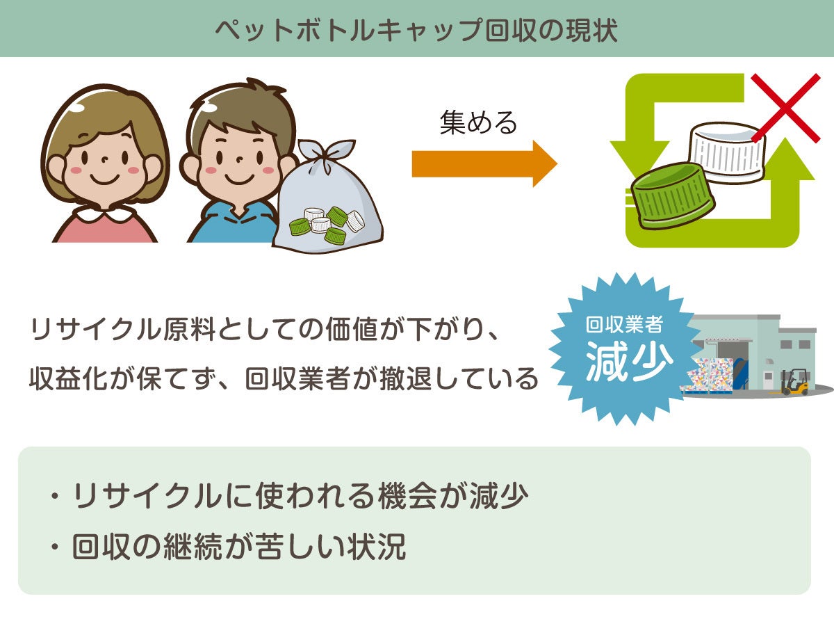キャップの材質が単一ではなくなり、リサイクル原料としての価値が下がり、さらに、仕分け作業の複雑さや人手不足なども影響し、原料生産する費用は大きくなりました。集めて加工するだけで赤字になってしまうため、キャップが溜まっているという状況です。