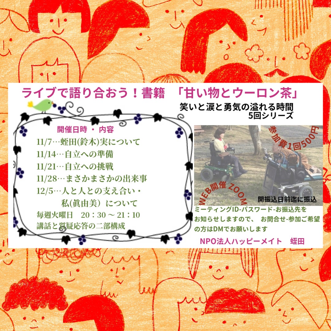 2023/12/05 22:38寒暖の差が激しい今日この頃です。皆さんはいかがお過ごしですか?実さんの亡くなった命日11月20日には懐かしい方達が焼香に来て下さり、改めて実さんが皆さんに慕われていたことに胸が熱くなりました。さて、11月に開催してきたライブで語り合おう!書籍「甘い物とウーロン茶」も終了を迎えました。Zoomミーティングに不慣れでしたので、ご参加頂いた方々には満足いただける企画ではなかったことと反省しております。申し訳ございませんでした。そこで、リベンジとしましてライブで語り合おう!第二弾を企画致しました。参加しにくい日時であるというお声も多かったので、今回は週末開催に予定させていただきました。詳細は下記に記します。皆さんお誘いあわせの上ご参加ください。 記 書籍「甘い物とウーロン茶」簡潔編 重度の障がい者が語るいきいきとした地域生活の実現 12/16(土) 16:30~17:10 親元での生活 12/17(日) 16:00~16:40 施設での生活 12/23(土) 16:30~17:10 地域での生活 12/24(日) 16:00~16:40 理想的な生活 参加費1回500円 開催前日までにお振り込みください。 ご参加ご希望の方はDMでお願いします。 ミーティングID・パスワード・お振込先をお知らせします。 もっと見る