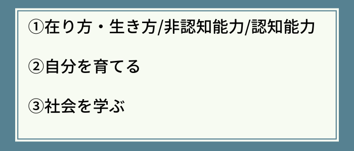 非認知能力と認知能力はあくまで“能力”であり、在り方生き方という使い方の“方向”次第で喜びも悲しみも生み出せてしまいます。そのため、在り方・生き方を特に重視しています。