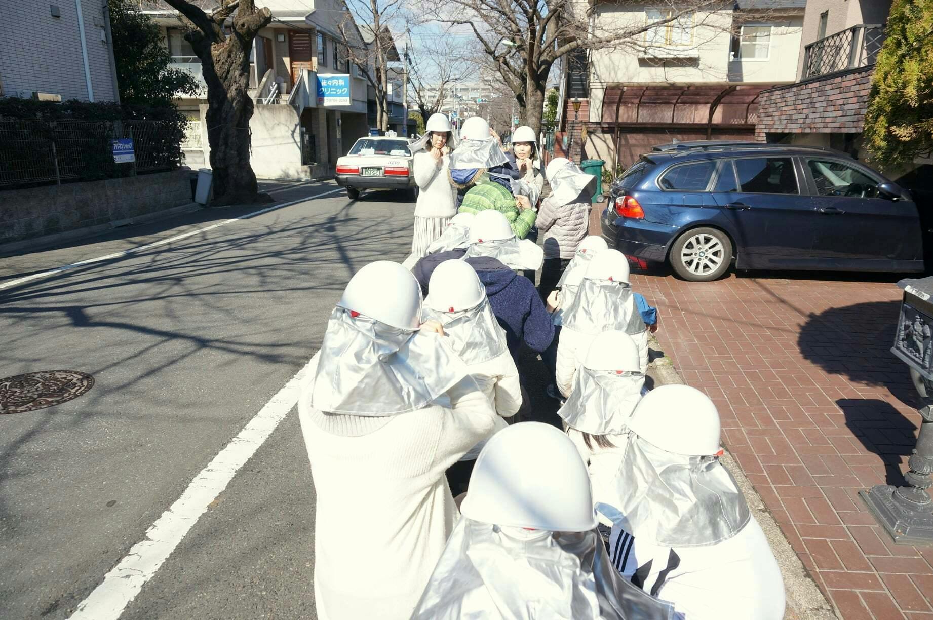 避難訓練も本格的。この防炎カバー付きヘルメットも、髪の長い生徒を守るために、生徒と一緒に調べてスクール資金とご寄付をもとに購入しました。