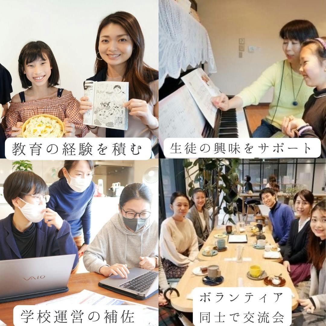 一般的な学校教育や、様々な教育の仕事に就く大学生や社会人にも広い視野を持っていただければと「研修付きボランティアスタッフ」を受けいれています。また年に2度、現元ボランティアスタッフ同士が交流できる会も開催しています。