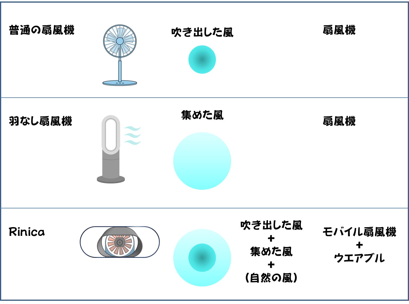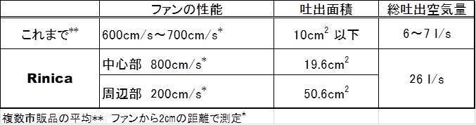 これまでと、Rinicaを比較すると以下のようになります。風は背中に向けるために、送風範囲を広げています。同時に乱流化され優しい風になっています。