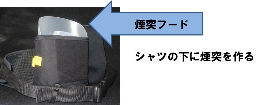煙突効果を生む、あるいはファンの冷却効率を上げるためにもシャツの下に風が通ることが不可欠です。帽子のツバの様な突起、これが煙突フードです。シャツの下に煙突を作る重要な役割を持っています。