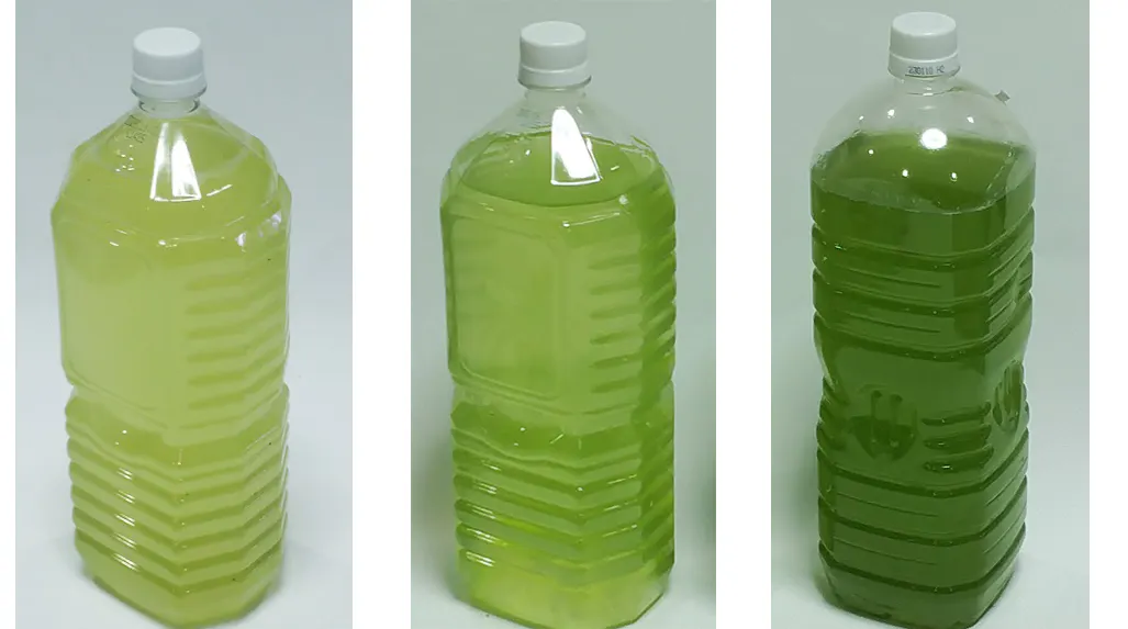 ブースター液を追加しなくても、日数を置くと、次第に濃いグリーンウォーターができます。1週間ではまだ発酵エサの影響で濁った緑色ですが、2週間程度で濁りは消えてきます。平均10日程度が経過し、濁りが取れた状態になれば(写真中央に近い状態)、ミジンコに与えるなど利用は可能となります。