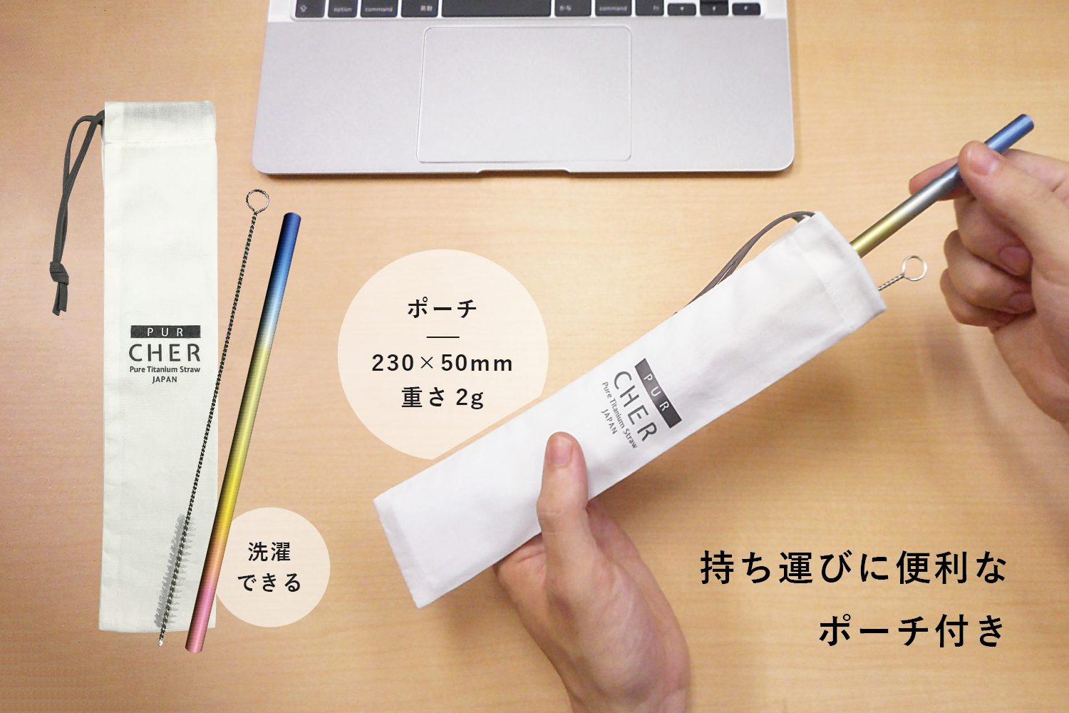 ポーチは綿100%使用。洗濯して繰り返し使えます。軽くて衝撃に強いチタンストローは 、マイストローとして気軽に持ち歩くには最適です。