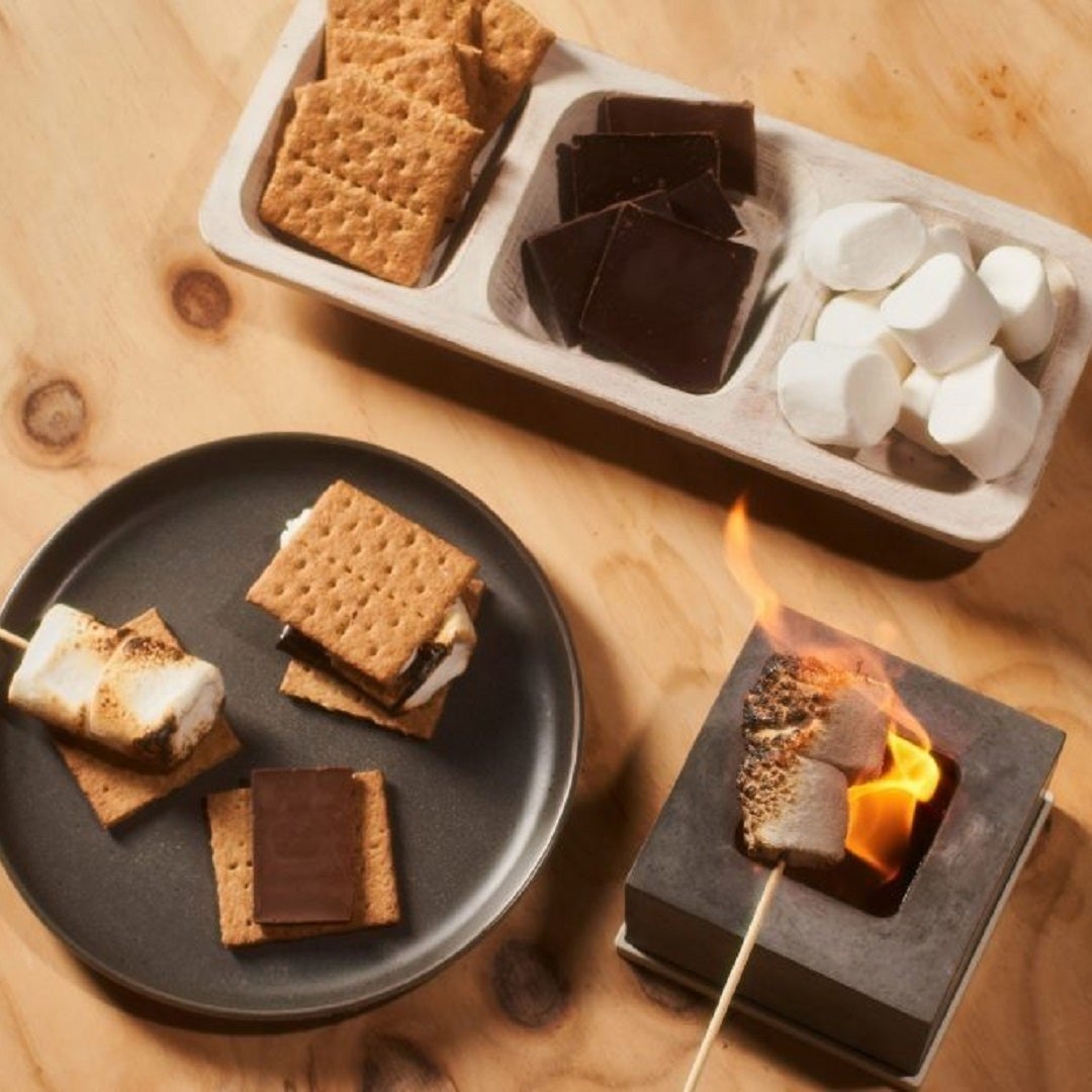 焼きマシュマロをチョコレートと一緒にビスケットにはさめば、あなただけのスモアーズが完成!