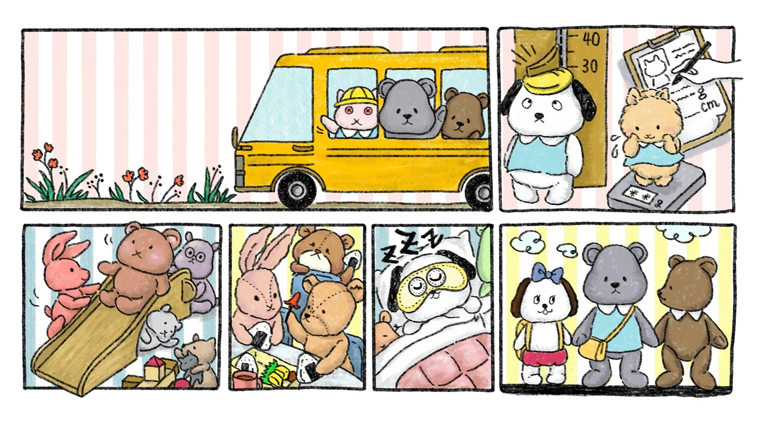 お預かりしている間は、入園式・身体測定・お遊戯会・お弁当・お昼寝などのイベントを、他のぬいぐるみと一緒に体験していただきます。