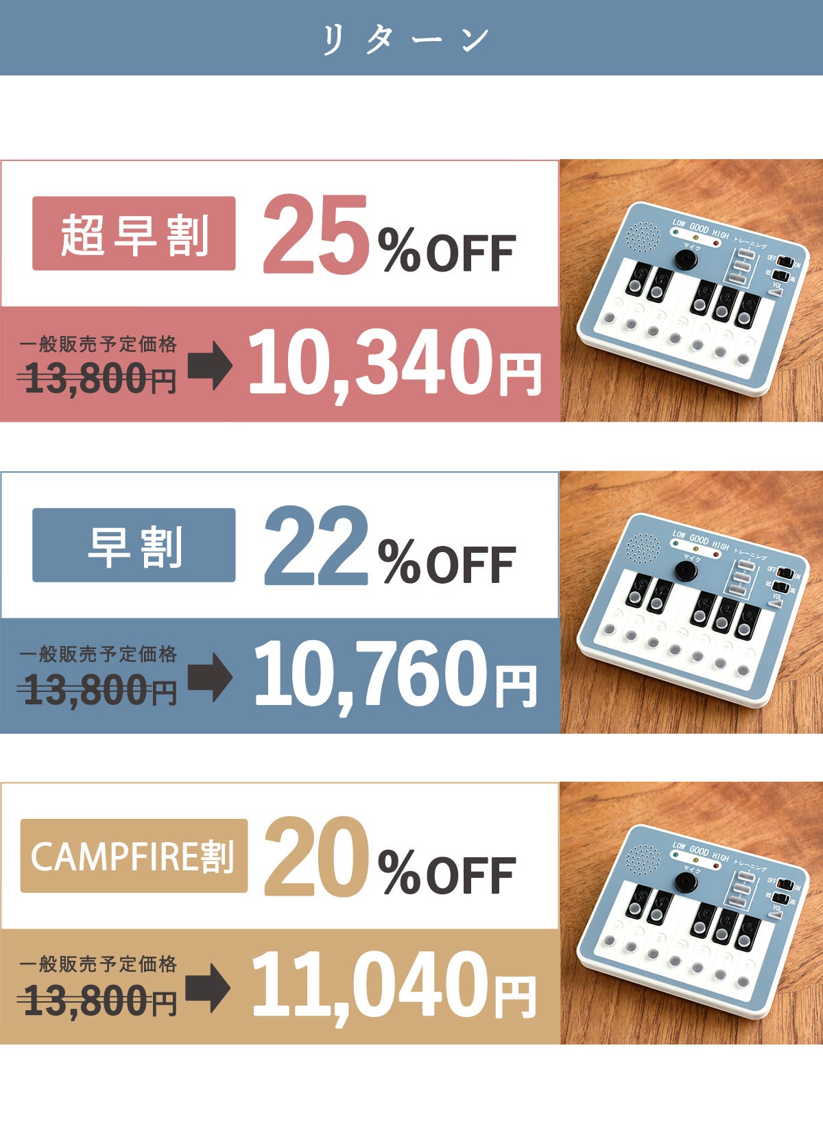 ・想定を上回る皆様からご支援を頂き、量産体制を更に充実させることができた場合、一般販売価格が予定価格を下回る可能性があります。
