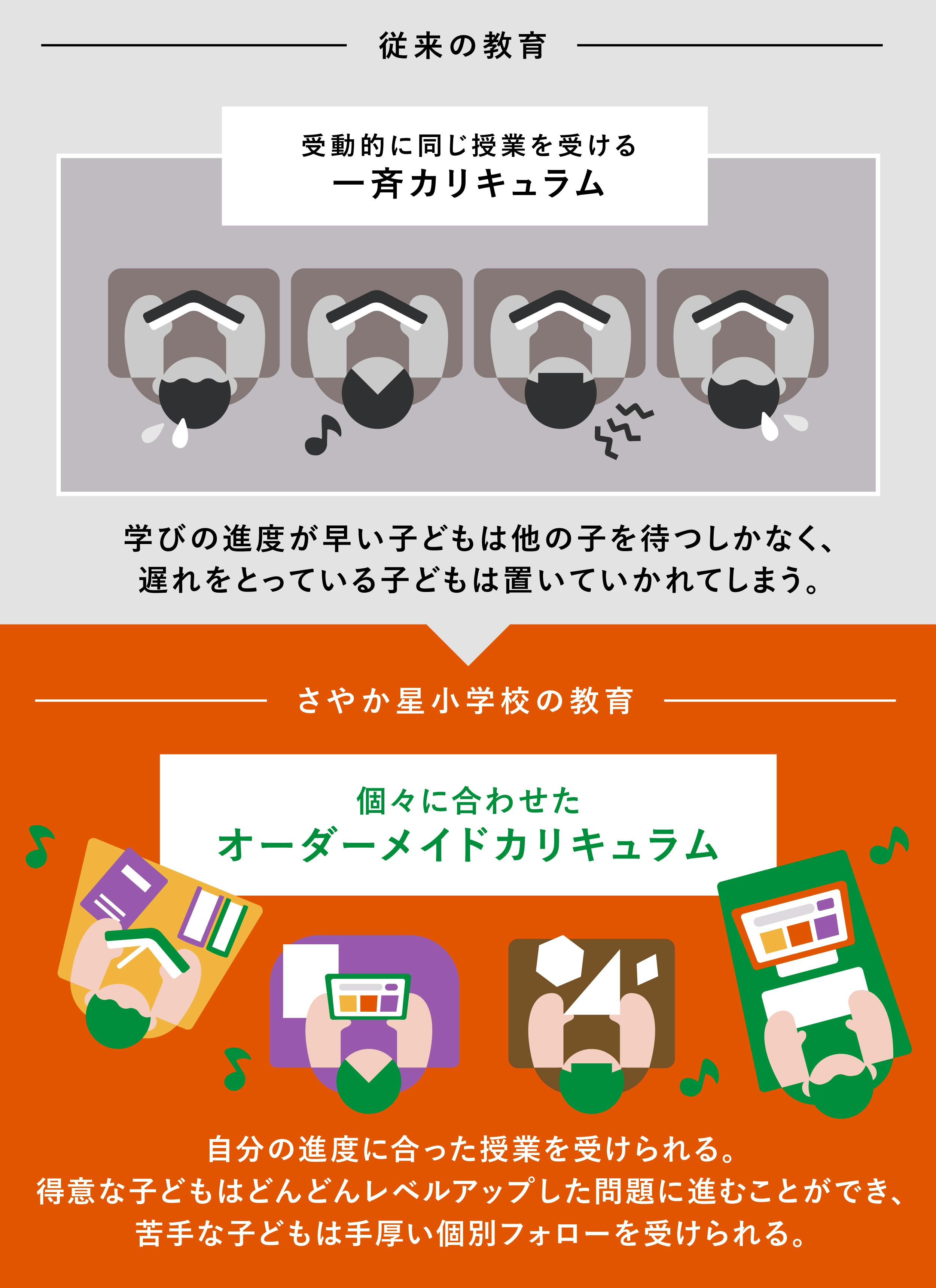 すべての子どもたちが共生するインクルーシブ教育を実現するために、さやか星小学校は3つのあたりまえ(①みんなが一律の授業を受けて一律の評価をされる、②問題行動を減らす、③子ども同士の人間関係を子どもの自主性に委ねる)を覆す、新たな環境を提供します。