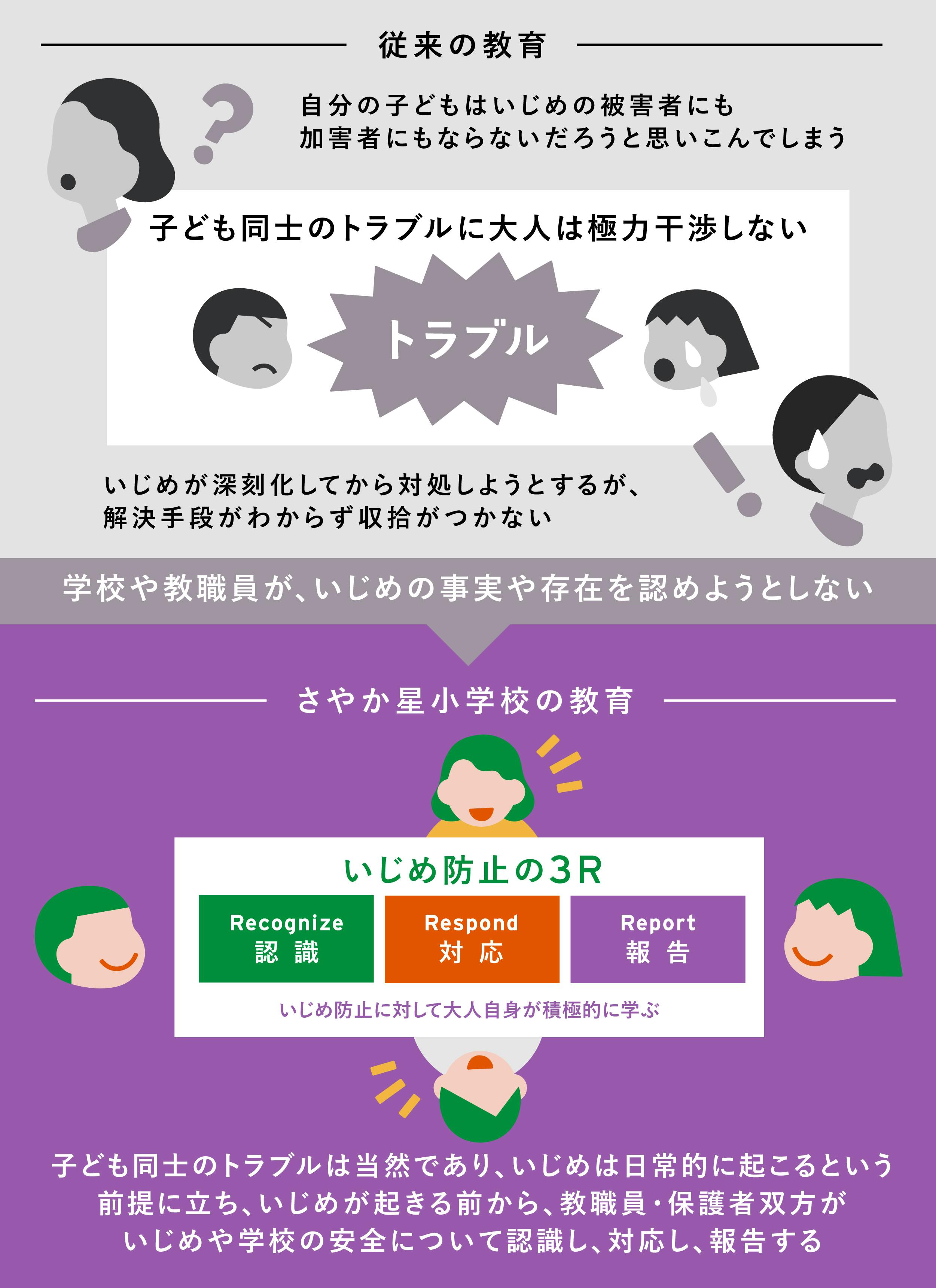 「大人もいっしょに」学ぶ環境「いじめ防止の3Rプログラム」を日本で初導入し、教職員や親が協力することでいじめを放置しない学校を目指します。