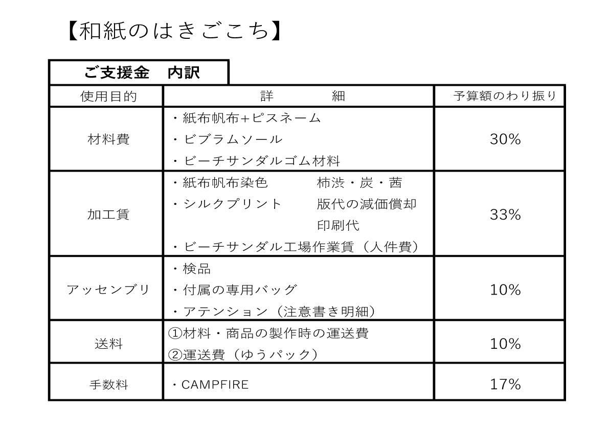 これまでにない自然由来の消臭・抗菌性の高い紙布と国産ビーチサンダルとのコラボ【和紙のはきごこち】のサラッとした足裏への感触で支援者の皆さんを満足できるプロジェクトにしたいと思います。