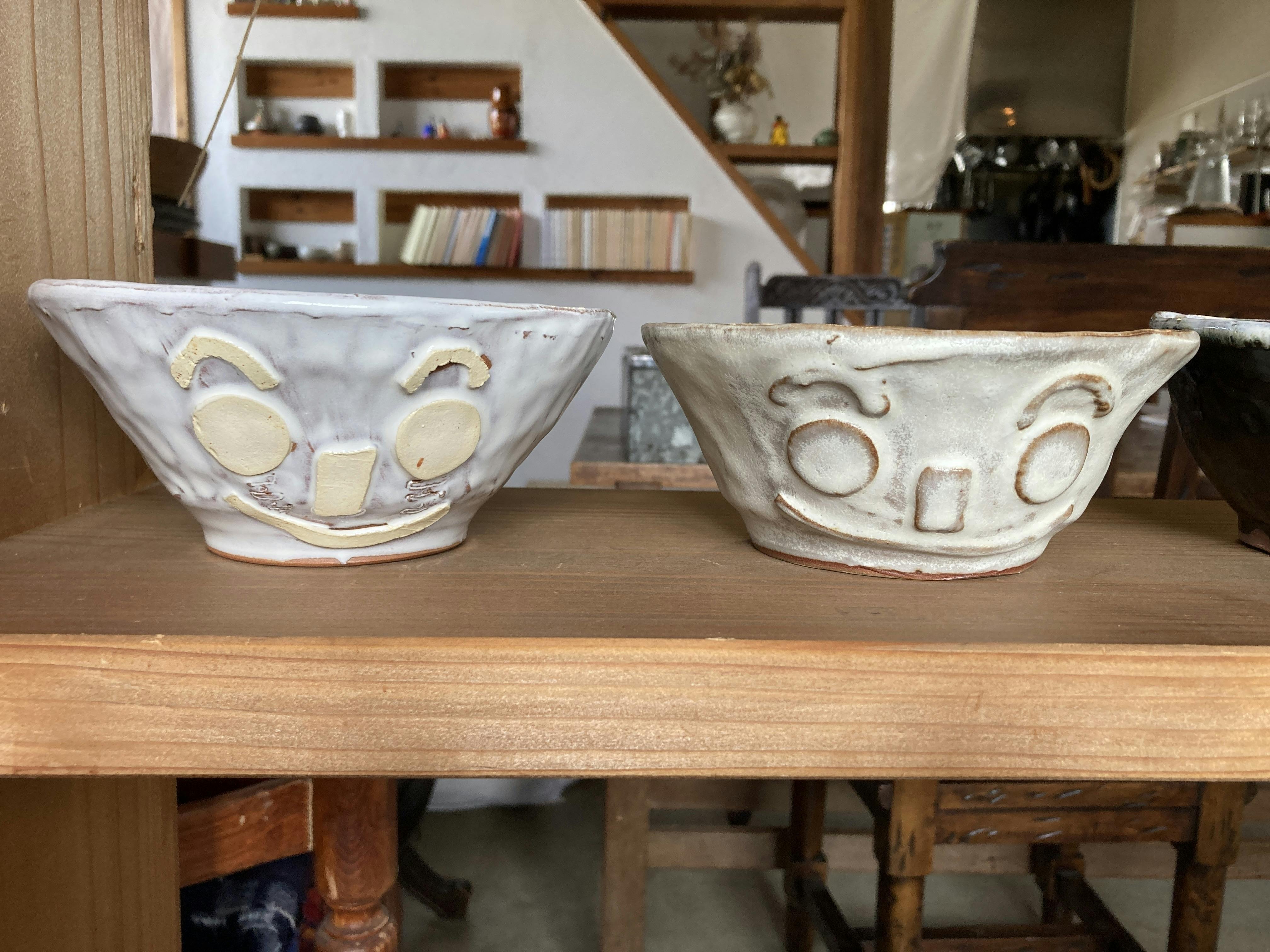 2022/07/21 13:06こんにちは。雨が上がったかと思えば、この強い日差し!暑さが戻ってきましたね。今回も開催中の「いえなか美術館」より作品をご紹介しつつ思うことを書いていきます。陶器の器たちは甲府市内にある障害者支援施設 青い鳥成人寮の方が作られたものです。意志の強そうな眉と目、にっこりとした口元。こちらを見ていて、インパクトがあります。先日、職員の方が観に来てくださいました。お話の中で、みんなたくさん作るのだけど、今、展示販売をする場所を見つけることが難しいとうかがいました。そういうことなら子ども食堂となる平家の出番ではないでしょうか。誰にでも来てもらえる場所になるための、来やすい居やすい場所になるための企画として面白いのではないか。そんな風に考えています。障がいがあっても無くても、大人でも子どもでも、国籍がどこであっても、今生活していく中でいろいろな立場や所属の人たちに接点を持つということは、その人にとって大きな価値になるように思います。普段の生活では出会えないかもしれない人と出会えることも、良い経験になるでしょう。それがこの先の誰もが来られる居られる場所につながると考えています。それと嬉しいことに、絵を描いてくださった方たちのご家族やお知り合いの方が来てくださるのです。初めましての方もおられます。良い機会をいただき、感謝しています。 もっと見る