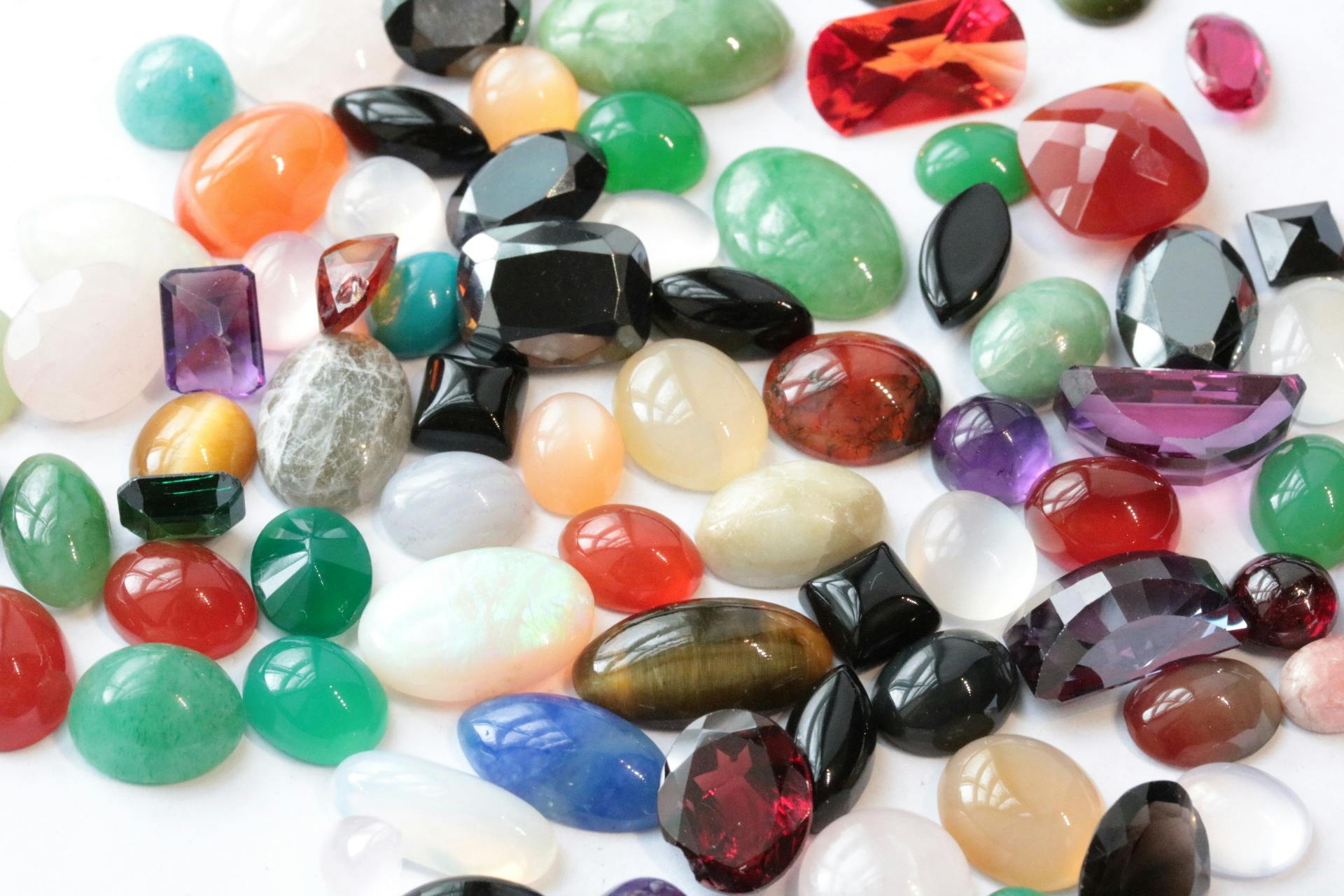 エメラルド・ルビー・サファイア・ローズクオーツ・アクアマリン・ブルートパーズ・アイオライト・ガーネット・アメジスト・シトリン・キャッツアイ・ペリドット・オパール・クォーツ・ターコイズ・翡翠・ラピスラズリ・オニキス・瑪瑙・ムーンストーン・カルセドニー・模造石など、その他たくさんの種類が入っています。
