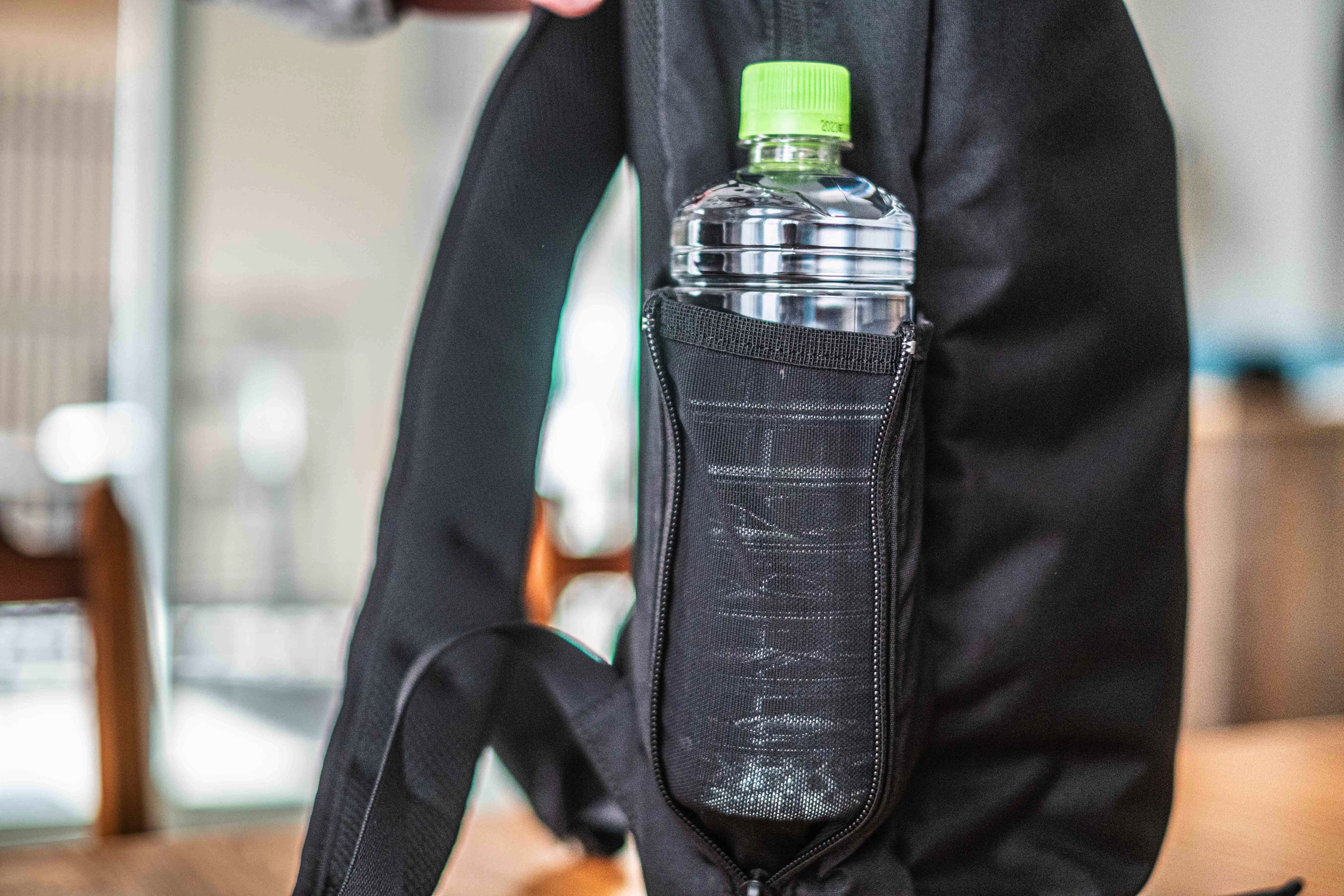 バックパックの片側にはホルダーを設けており、タンブラーやペットボトルを収納できます。使わないときはファスナーを閉じておけば、見た目の印象がスマートに。