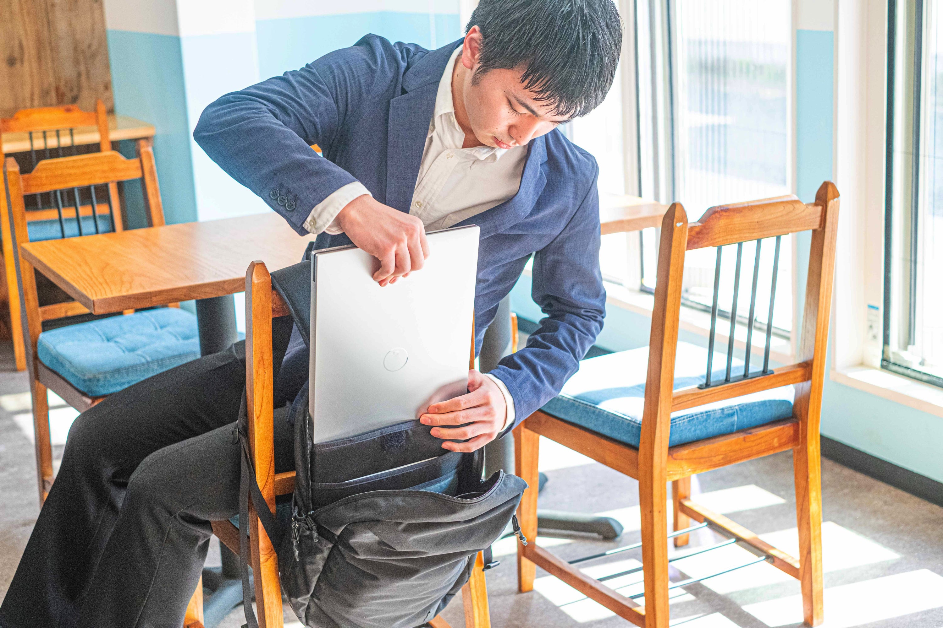 さらに片側が大きく開く構造なので、PCへのアクセスは非常にスムーズ。オフィスやカフェに到着したら、サッとすぐに取り出しが可能です。
