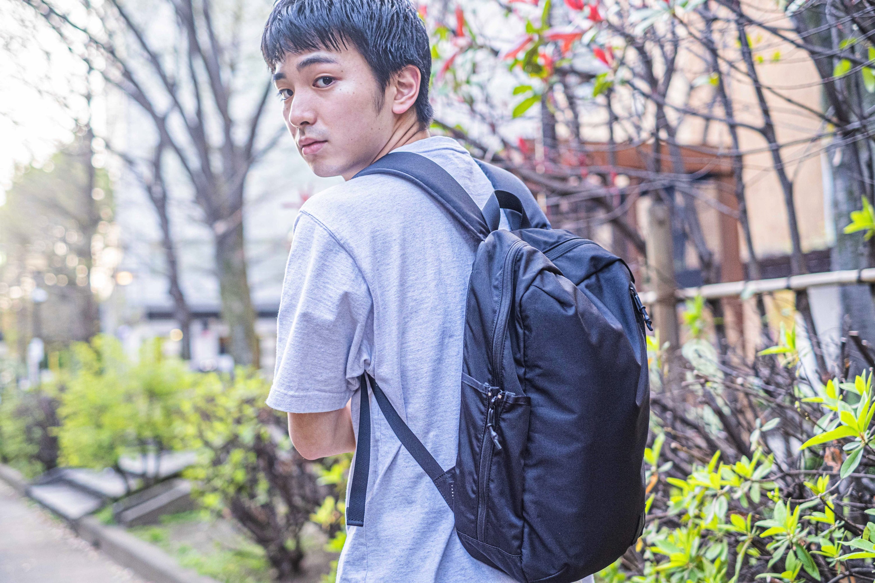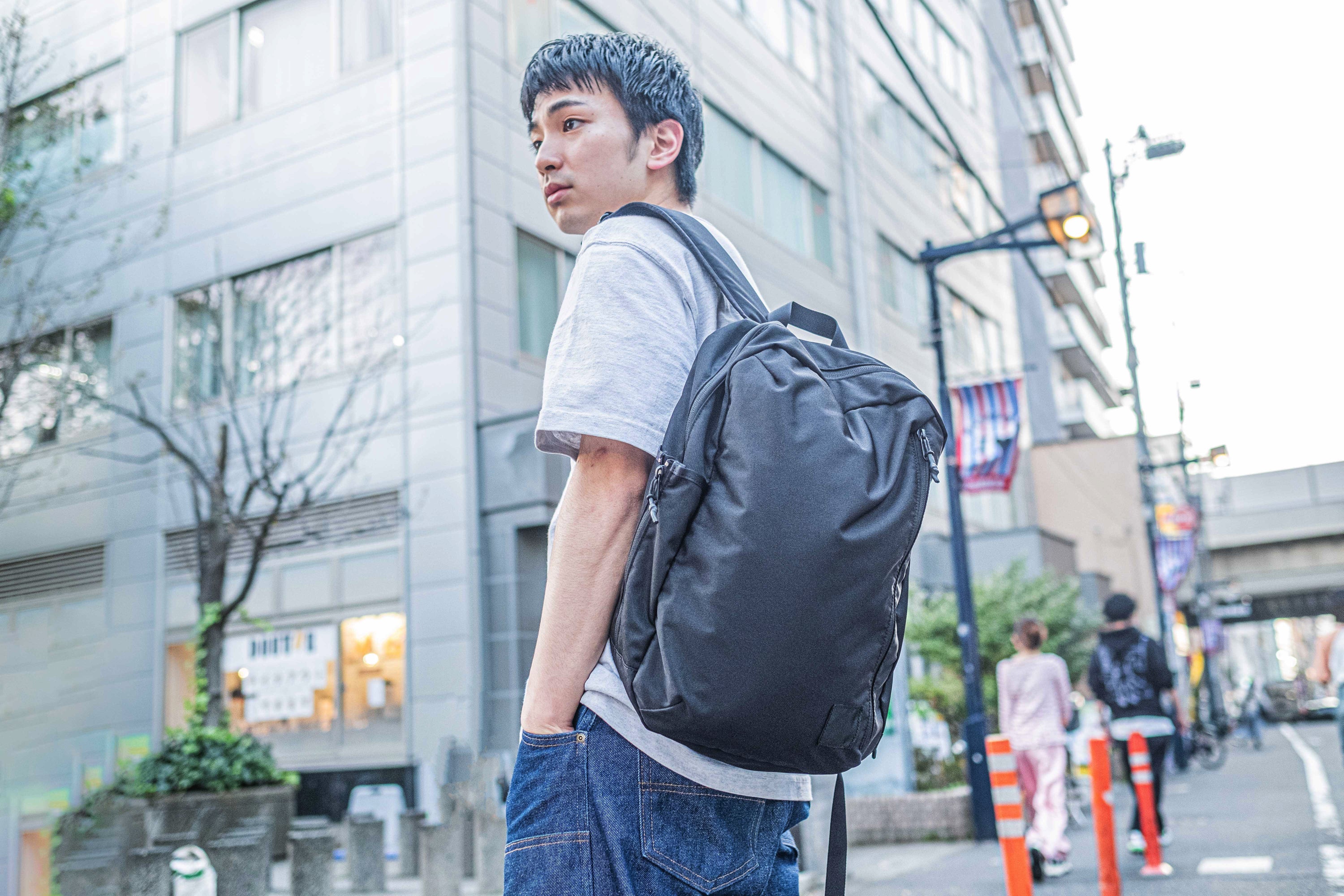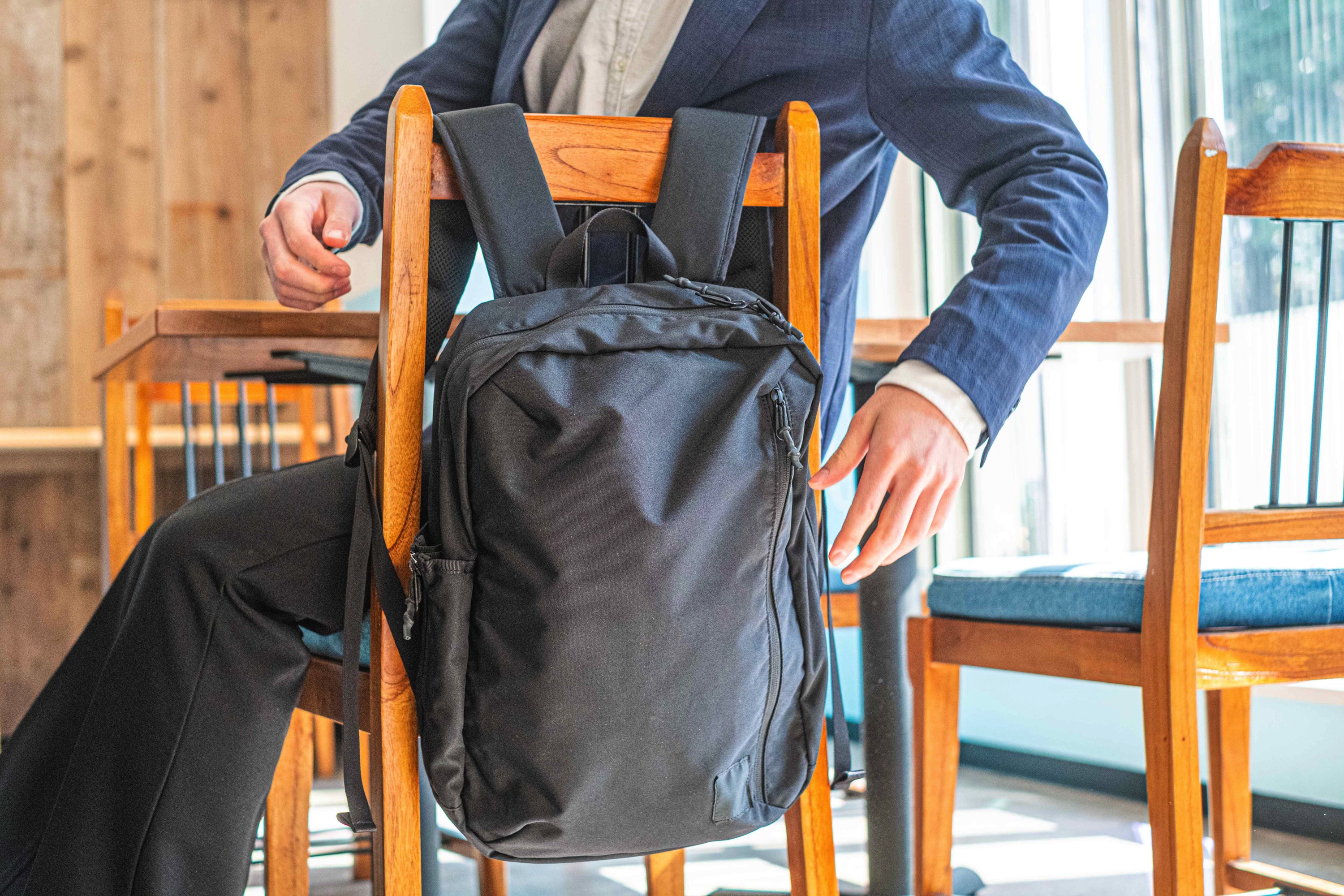 ジャケットスタイルでもTシャツでも違和感なく背負えるのは、無駄を省いたデザインのなせるワザ。