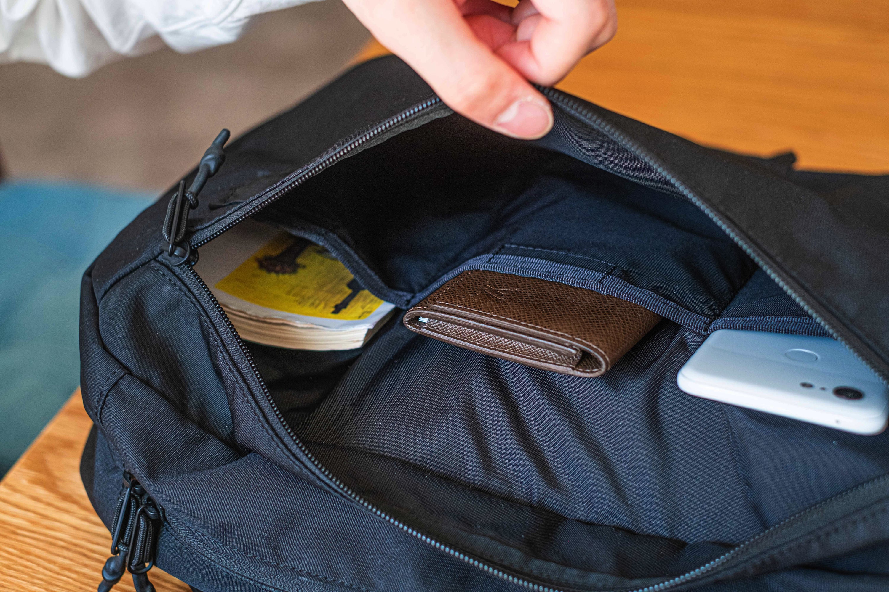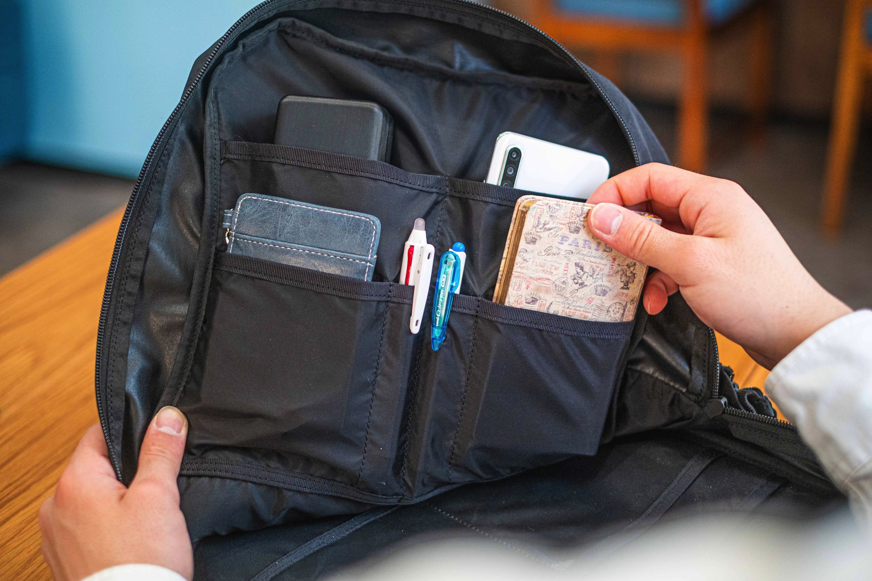文庫本や財布、スマートフォン、モバイルバッテリーなどは、ここにある3つの小物ポケットに入れておくと取り出しやすくて便利です。
