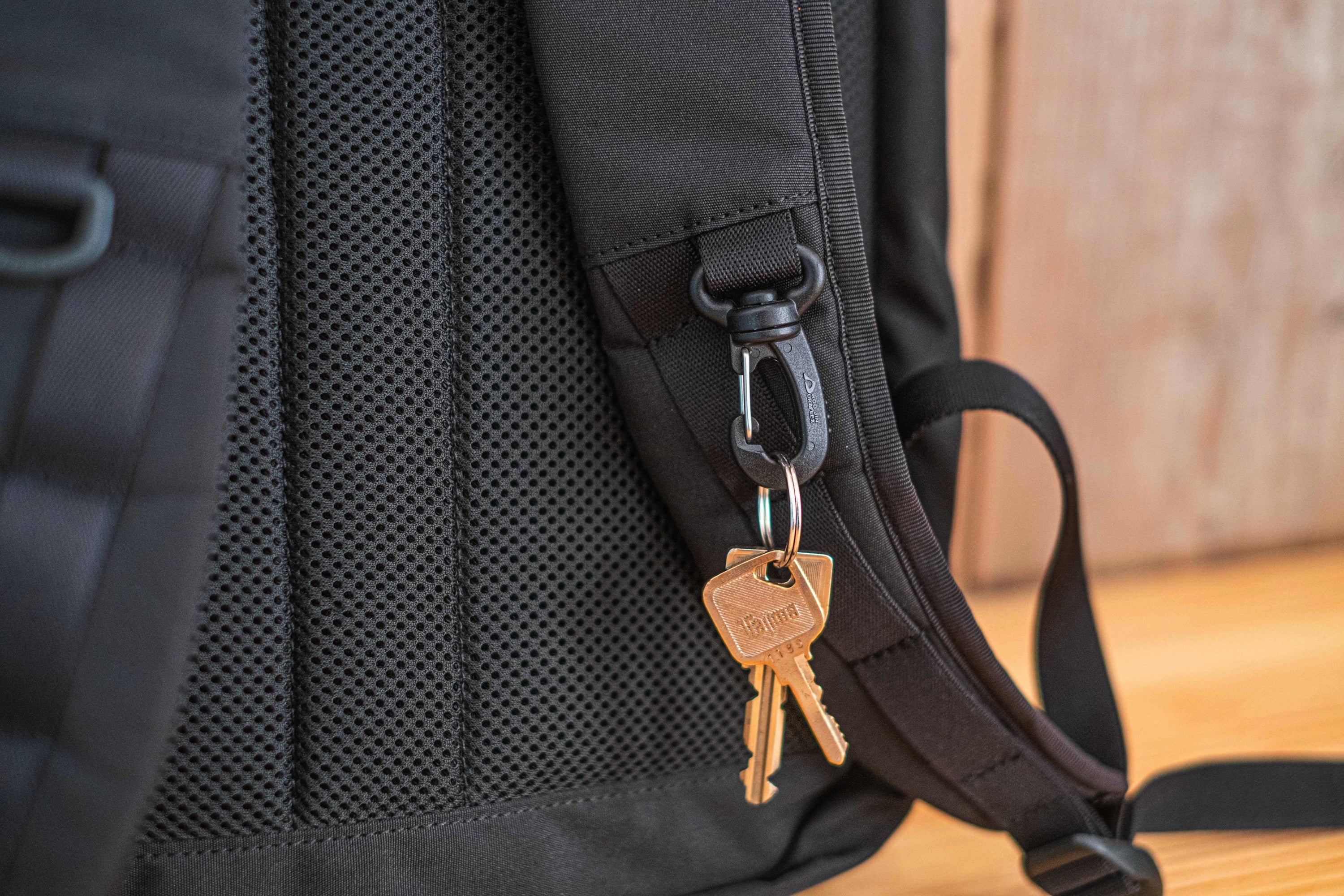ショルダーストラップ左側のナスカンには、鍵や小物をかけるのに便利。すぐに使いたいアイテムも、ここにあればサッと手に取れます。