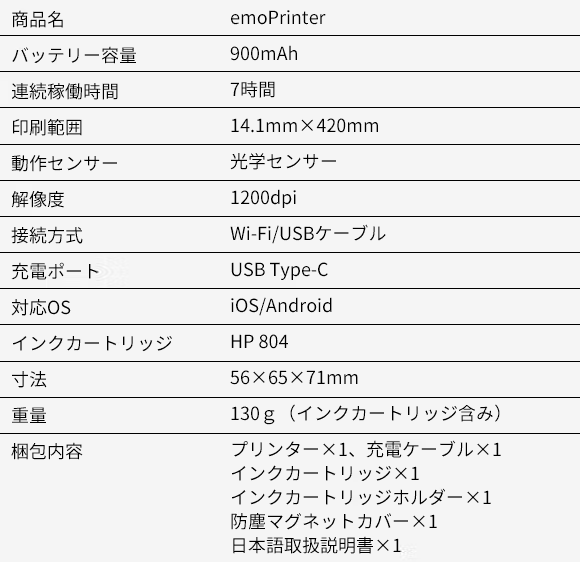 emoPrinterは900mAhの大容量バッテリーを搭載しているため、フル充電すると最大7時間の連続稼働が可能!大容量インクカートリッジ がが付属、、HP大容量インクカートリッジに互換性あり、標準モードでは415枚のA4用紙を印刷できます。