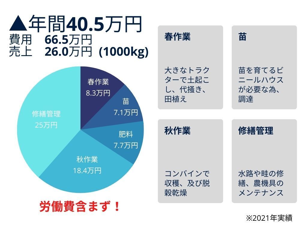 こうして1年間大切に大切に育てたお米の買取価格は破格で、毎年赤字状態のため、肉体的負担、時間的負担に加え、金銭的負担が伸し掛かっています。保有している田んぼの大きさ、専業化、あるいは兼業か、などの経営体制によって負担額は異なりますが、我々の場合、兼業農家として田んぼは63a(=約6反、=約1890坪)保有し、負担額は年間約40万円にもなります(ジジのポケットマネーで赤字補填)。このような小さな兼業農家では、数千万円するような農機具では採算が取れません。昔は、となりのトトロのように親戚総出で人手も足りましたが、今の時代、兄弟姉妹は皆都会へ出てしまっています。そのため、特別な機械を使う田植え、稲刈り、脱穀の三工程を専業農家さんに外注しています。加えて、種あるいは稲、肥料などの必要経費も発生します。無事に育ったお米を農協JAに卸しているのですが、買取価格は格安です。ジジによると「米作りってもんは、必要経費だけでもギリギリ黒字、あるいは赤字。労働費を入れたら、割に合わねえわ!」と…。