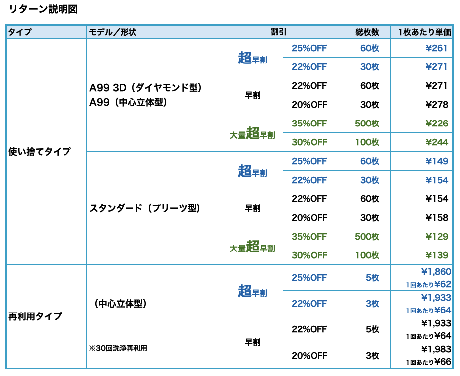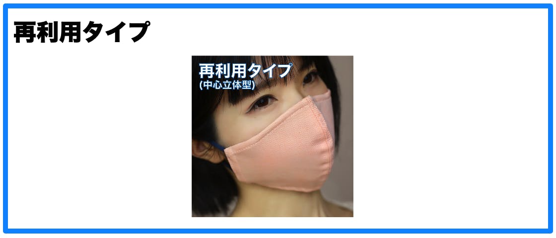 【高性能ナノマスク】は「使い捨てタイプ」3つと「再利用タイプ」1つで、合計4つのタイプをご用意しています。好みに合わせてお選びいただけます。