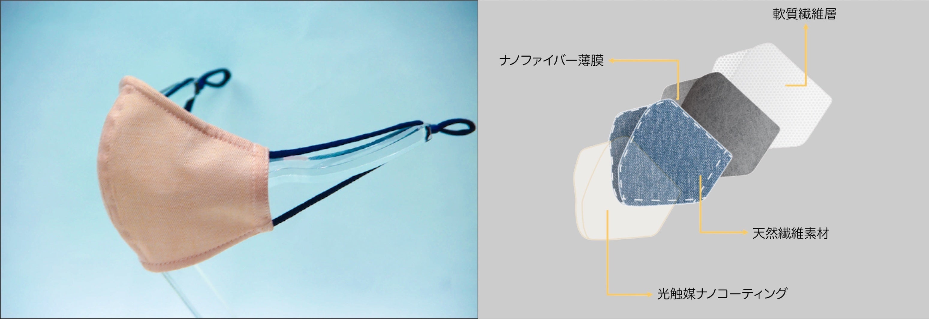 ナノファイバー薄膜を光触媒コーティングした天然繊維で挟み込むことで、何度も洗って再利用することができる経済的なマスクです。マスクの中心に縦ラインの入った中心立体型の形状です。今回はグレー、オレンジ、グリーン、デニムブルーをご用意しています。
