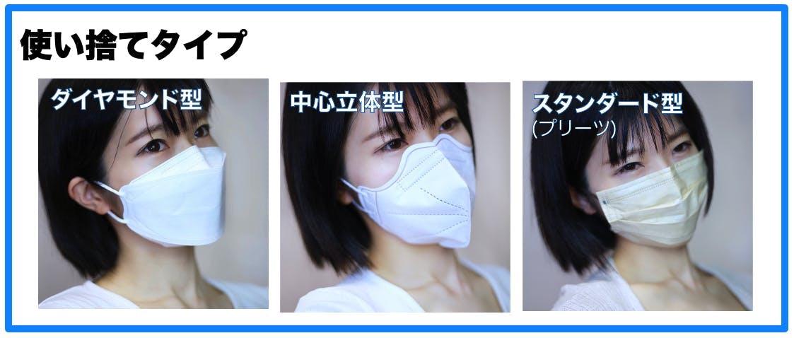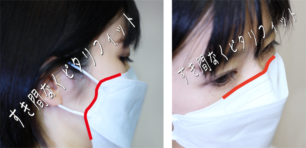 ダイヤモンド型と中心立体型は顔の形状にフィットして顔とマスクの間や鼻部分に隙間ができにくく遮断性が高いのが特徴です。鼻の箇所にワイヤーが入っていて高い密着性を実現しています。どちらの形状も口の周りに空間が確保されるので呼吸がしやすく、リップがマスクに付きにくい形状です。