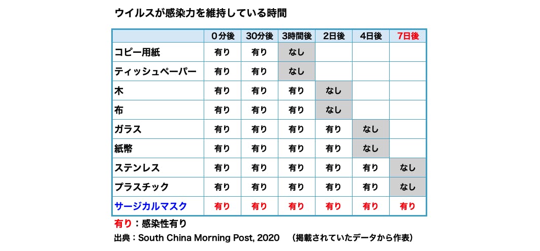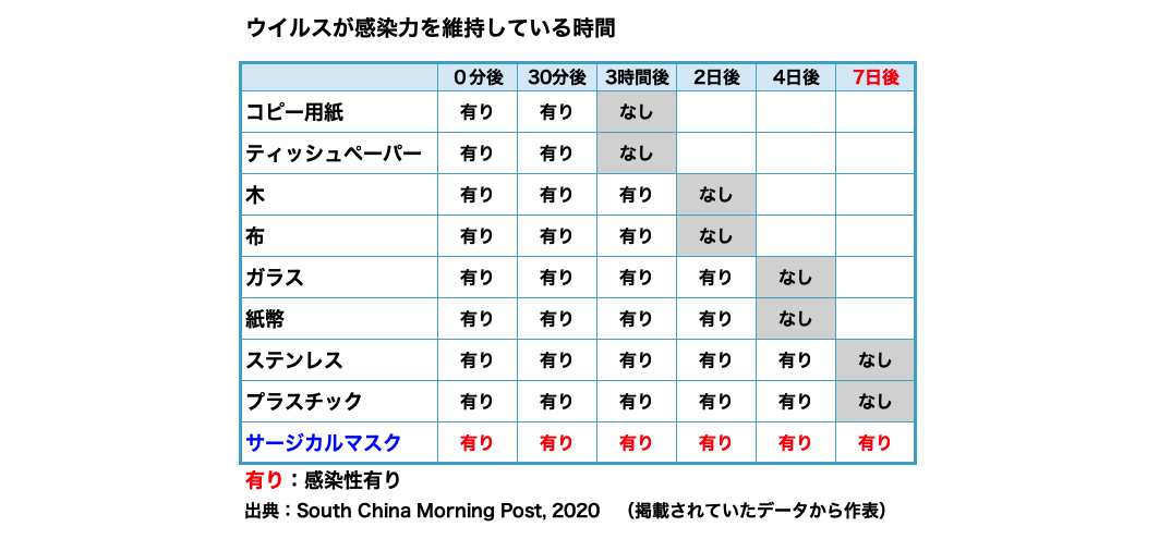以前、香港大学の調査結果として『Coronavirus can stay on face masks for up to a week, study finds』(日本語訳『コロナウイルスはフェイスマスクに1週間も付着することが判明』という記事が地元の新聞に掲載されました。