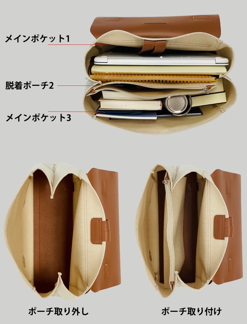 幅35cm縦24cmサイズのポーチ付きで、バッグの中に取り付けて収納をよりきれいにしてくれます。取り外した際には、ポーチだけを使用できます。