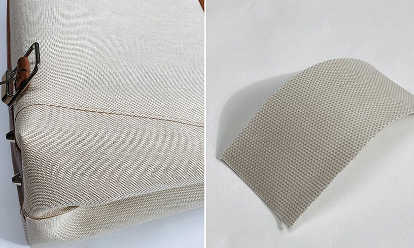 色味の柔らかいツイル原糸を混ぜて高級感のあるファブリックです。頑丈で繊細な編み込みでキャンバス生地より耐久性に優れ、汚れや毛玉に強いです。生地の内側も水に強い素材です。