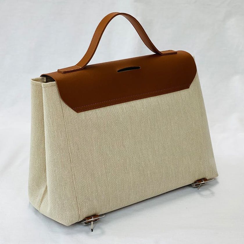 トートバッグ用持ち手サイズは幅2.5cm、高さは8cmとしていくつもの修正を通じて完成品が出来上がりました。お持ちのスーツケースのハンドルにも簡単に掛けられるので、出張や旅行時にも便利に使えます。