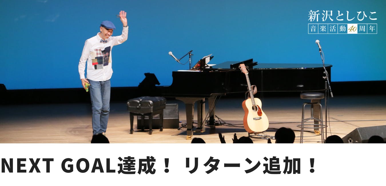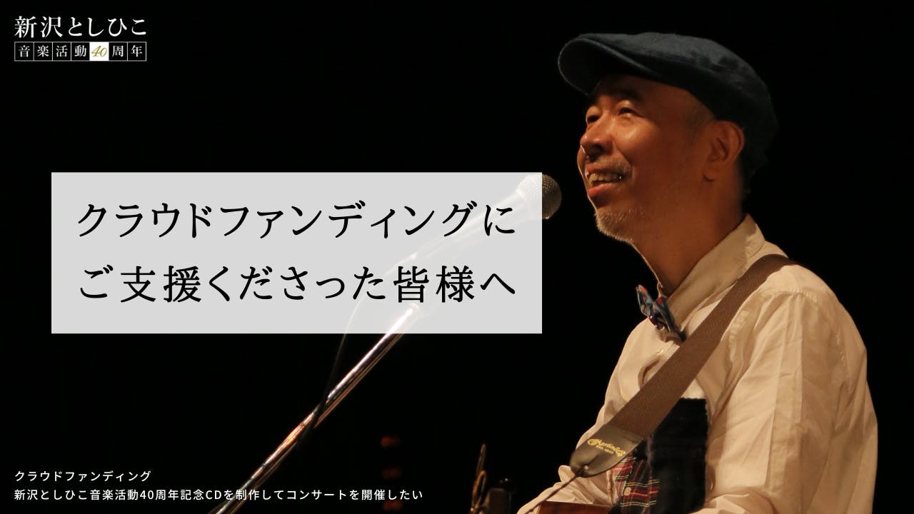 このクラウドファンディングは、新沢としひこ音楽活動40周年を記念したCDの制作と、そのCDを発表するコンサートをする、ということを目的としてスタートしました。そして、ありがたいことに目標額を達成することができました。ご支援、ご声援、あたたかいメッセージ、本当にありがとうございました。CDの制作もコンサートの開催も実現可能となり、とてもうれしく思っています。