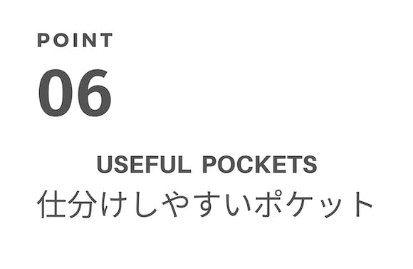 ファスナーポケットにはモバイルバッテリー・イヤフォン・ペンなど小物を分けて収納、整理することができます。