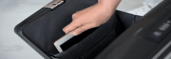 スーツケースフロントポケットにモバイルバッテリー用収納ポケットがあります。中にあるケーブルにつなげて、スーツケース本体から直接充電することが可能です。