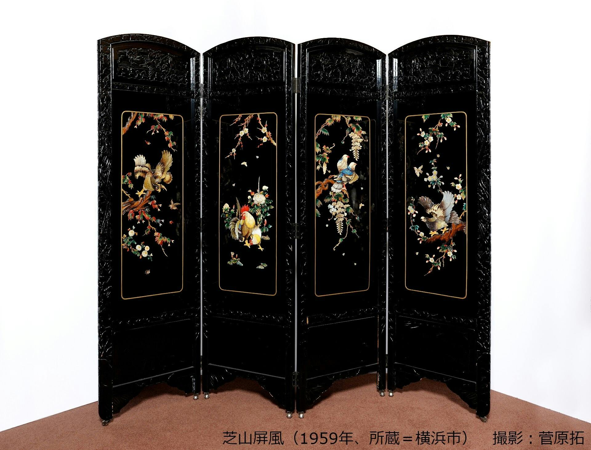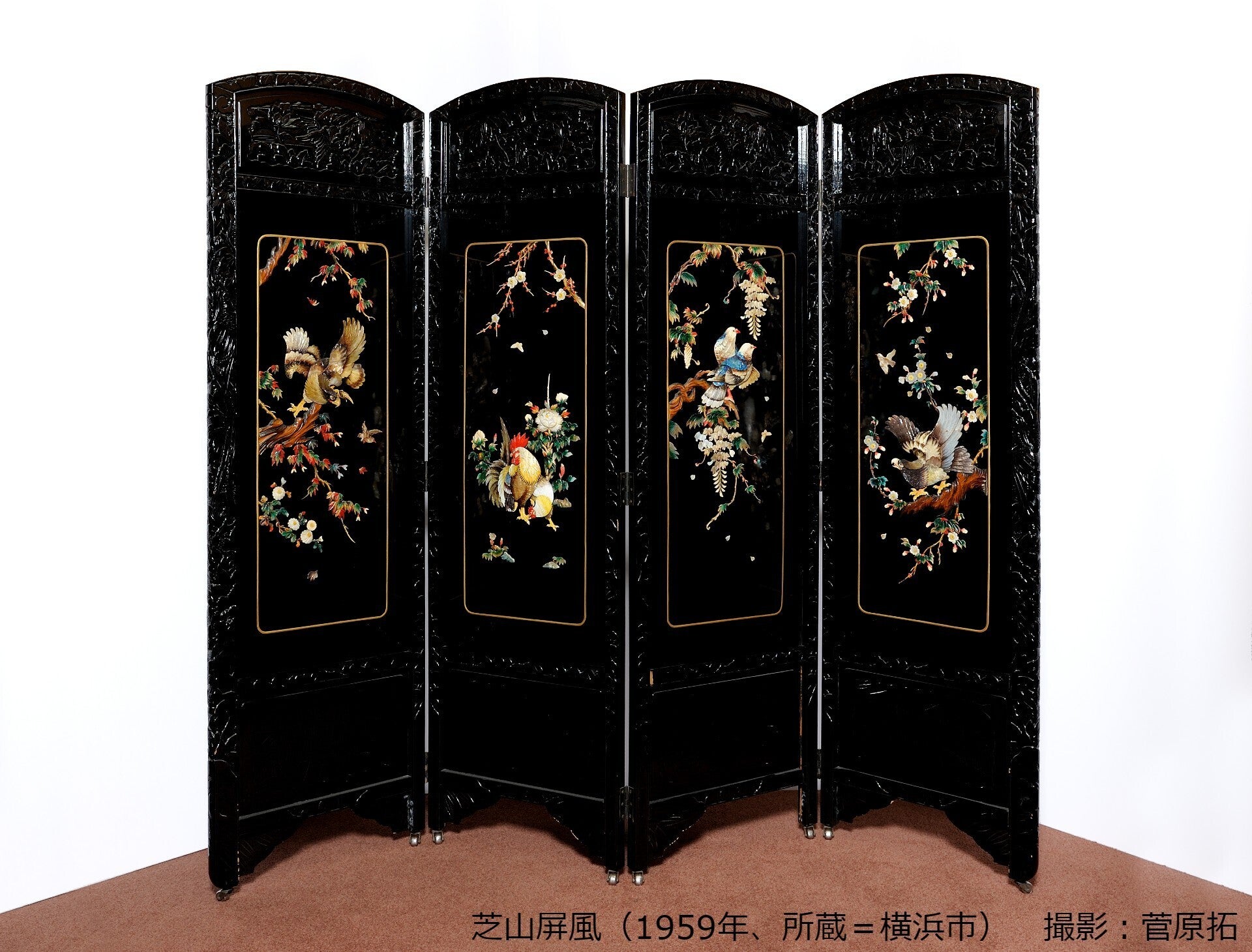 芝山象嵌は、貝・象牙・べっ甲・珊瑚などでつくった花鳥や人物などのモチーフを、素地から盛り上がるように嵌め込むのが特徴です。横浜でつくられた芝山漆器は屏風など家具から写真アルバムなどの小物まで多岐にわたり、また「寄せ貝」と呼ばれる横浜独自のダイナミックな技法が外国人に好まれました。