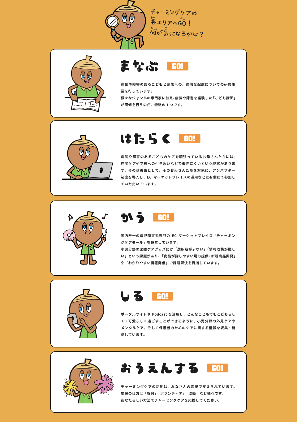 ●ポータルサイトやPodcastを活用し、どんな子どもでも子どもらしく・可愛らしく過ごすことができるように、小児分野の外見ケアやメンタルケア、そして保護者のためのケアに関する情報を「まなぶ・はたらく・かう・しる・おうえんする」という5軸で展開し情報収集・発信しています。