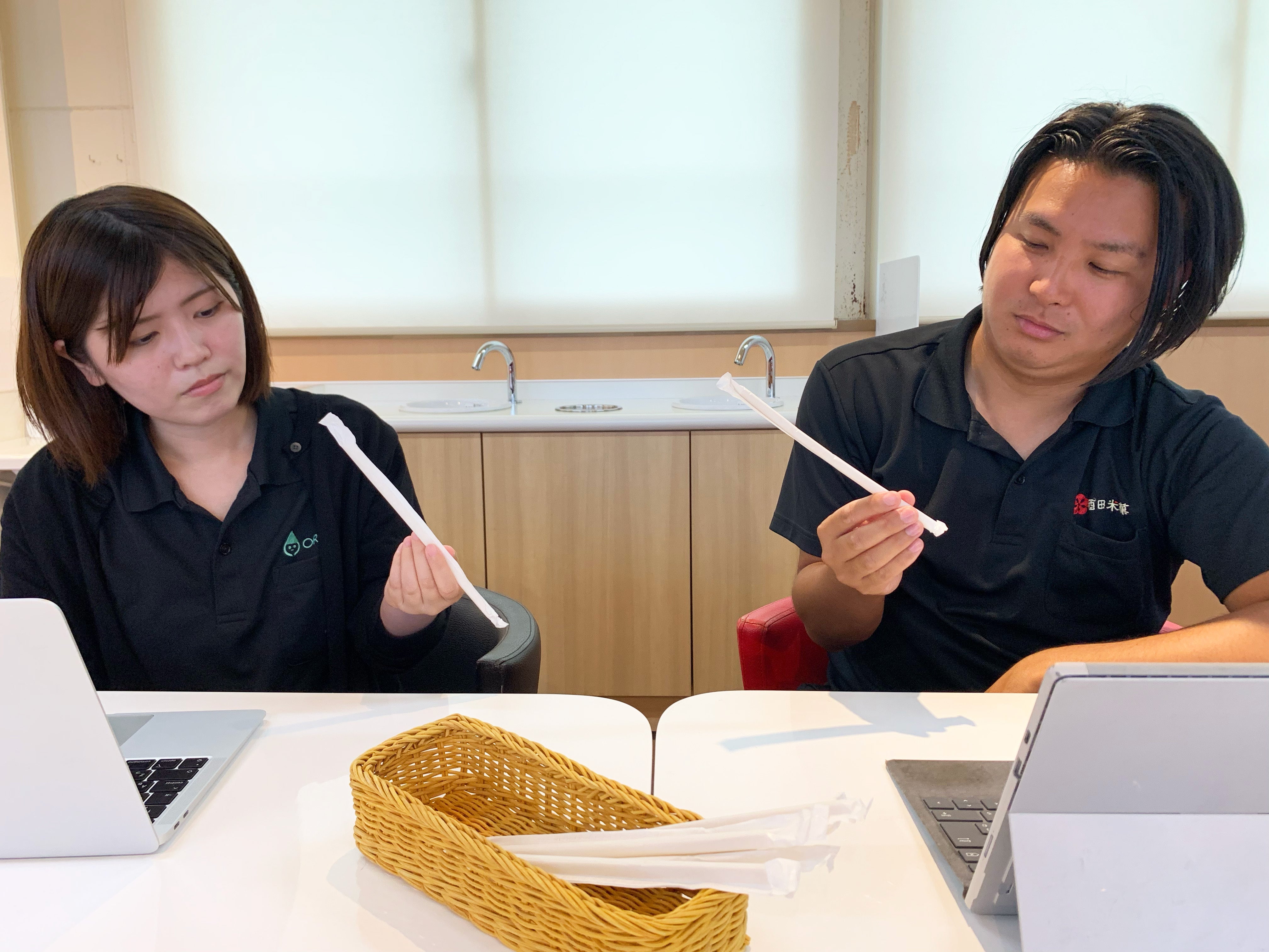 山形のソウルフード「オランダせんべい」を製造している『酒田米菓』の【 eco⁺MEストロー”斜め”ラボ】の高橋と今井です。