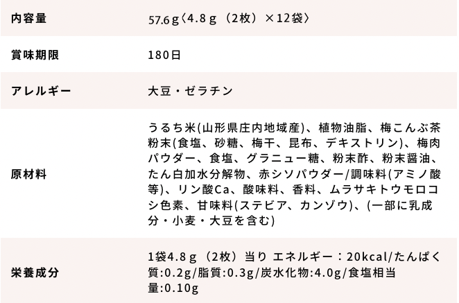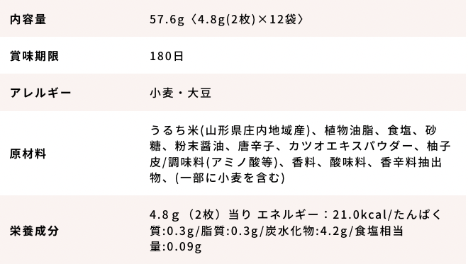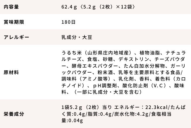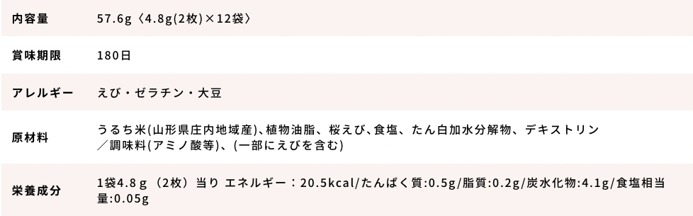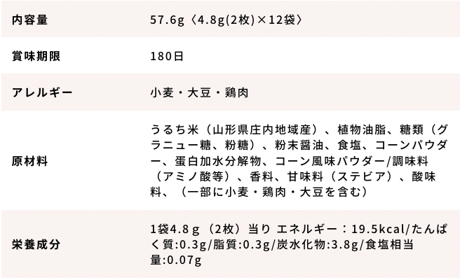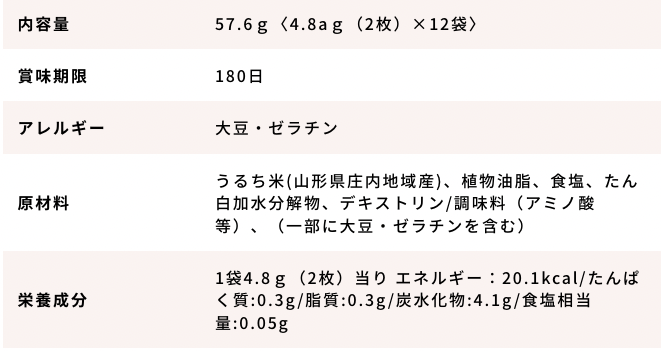 ・原材料 うるち米(山形県庄内地域産)、植物油脂、食塩、たん白加水分解物、デキストリン/調味料(アミノ酸等)、着色料(赤3、青1、黄4)、(一部に大豆・ゼラチンを含む)