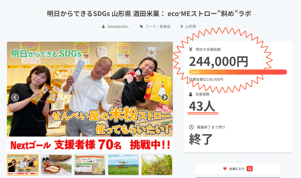 2022/08/29 11:05この度は「明日からできるSDGs 山形県酒田米菓: eco⁺MEストロー”斜め”ラボ」に沢山の皆様からご支援いただき、目標金額より【244%】越えを達成することができました!!誠にありがとうございます。初めての試みでしたので不安でいっぱいでしたが、皆様の温かいお言葉に励まして頂きここまですることができました。ご支援いただきました皆様のお陰です。これより順次リターンの発送を行ってまいりますので、今しばらくお待ちください。また、お届け先の住所変更したい方は下記メールアドレスにご連絡くださいませ。※今後のご連絡メールアドレスはこちらになります→【sakatabeika.official@gmail.com】日々の活動報告に関しましては、酒田米菓公式インスタグラム【@sakatabeika_official】にて投稿していきますのでご確認くださいませ! もっと見る