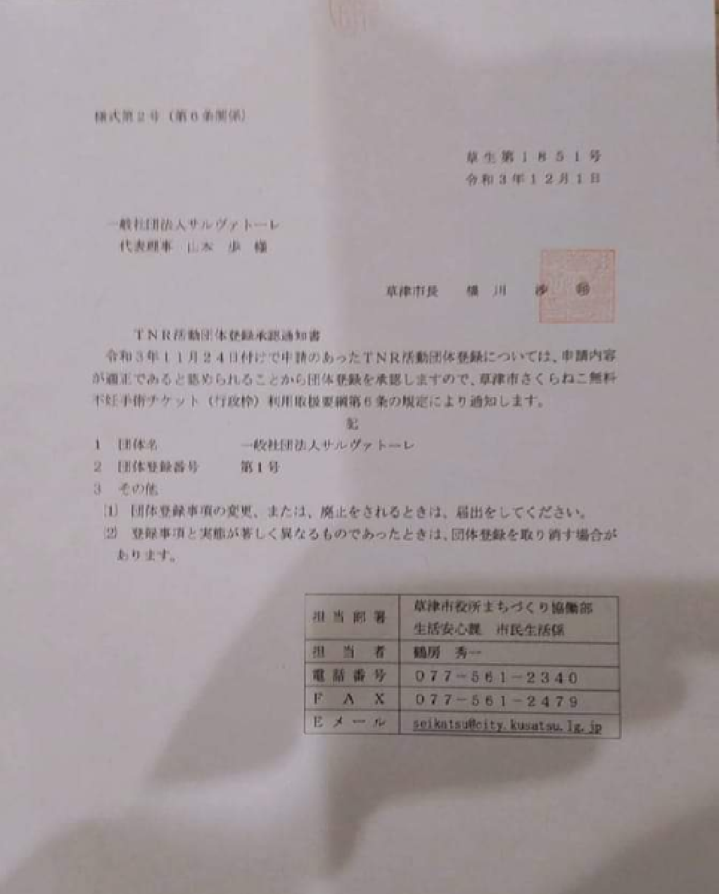 草津市内ののら猫については、草津市役所が申請して下さる行政枠のチケットを使用しており、草津市以外ののら猫に関しては法人名で申請する団体枠チケットにて、滋賀県のTNRに力を入れております。